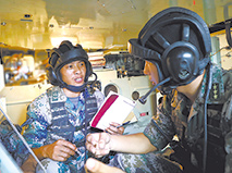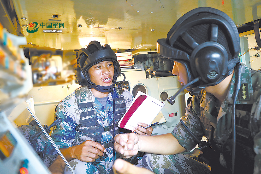 陈清(左)与战友探讨战车维护业务。