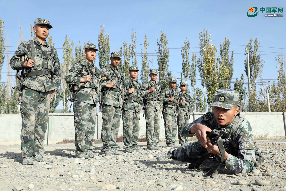 新兵3连5班班长王武正在给新战士演示战术基础动作。