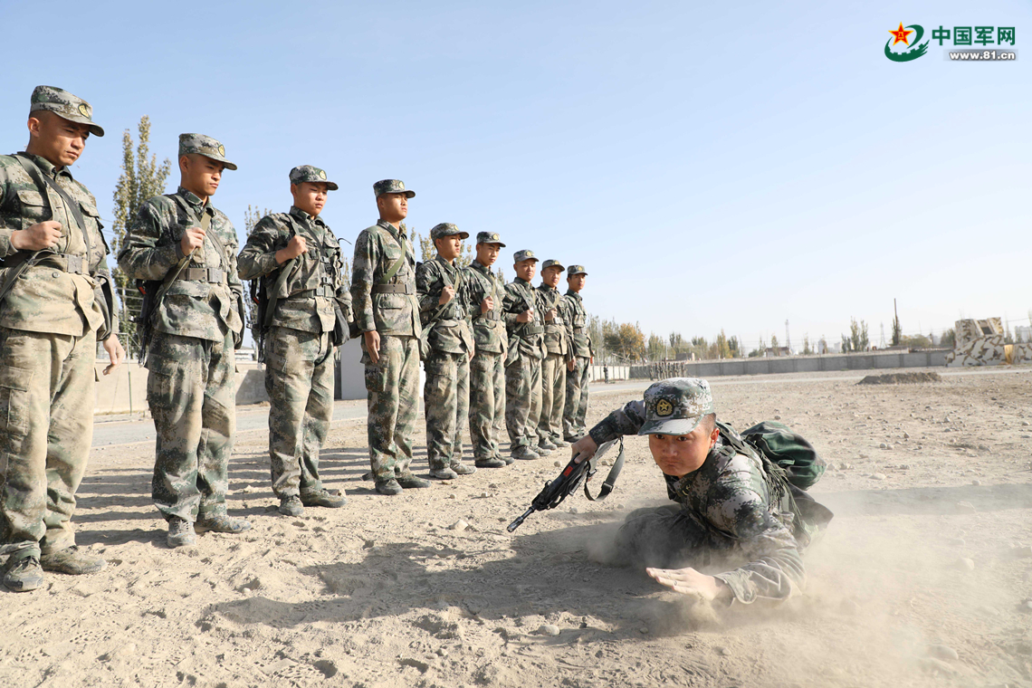 新兵3连8班班长周涛正在给新战士演示侧姿匍匐战术动作要领。