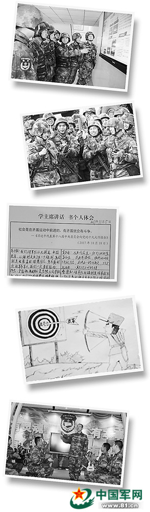 (从上至下:浏览专题网页、快板说唱宣讲、学习体会摘登、精心绘制漫画、“士兵讲坛”发言)