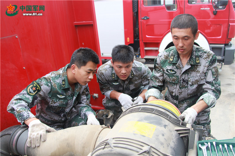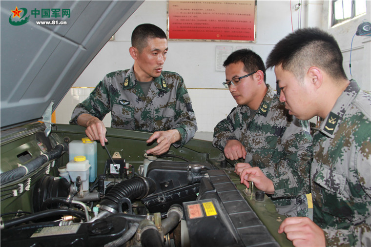 李洪波与战友们对车辆进行检修