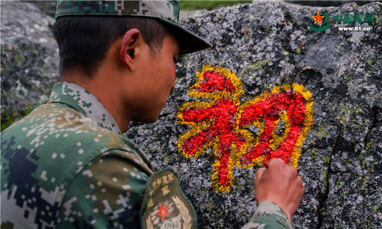 南部战区陆军某边防旅一名战士巡逻至某点位。崖壁之上,他深情地描红“初心”二字。