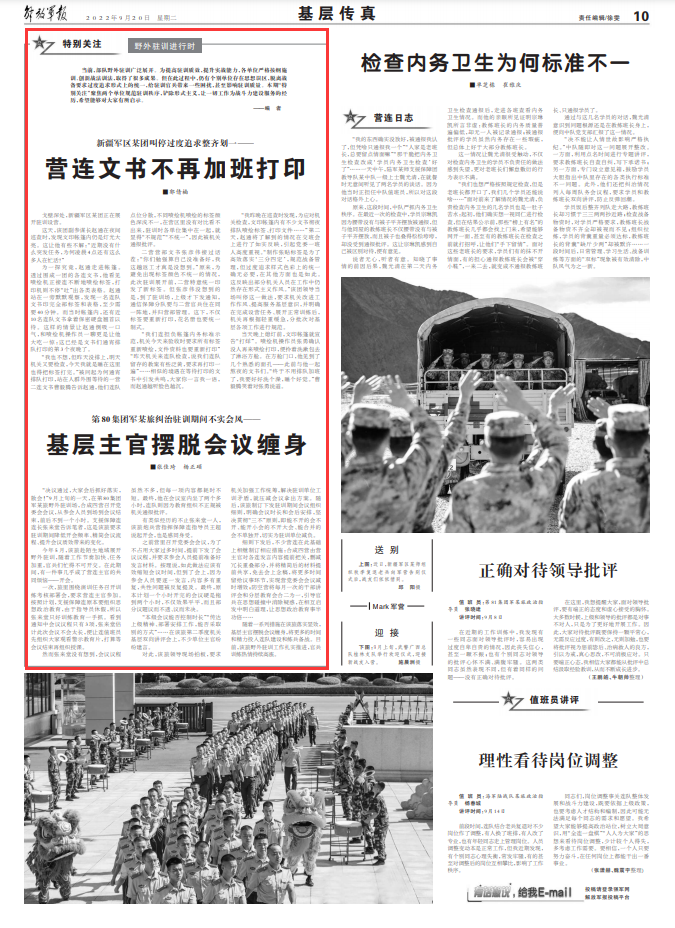 “本级会议能否控制时长”“传达上级精神、部署安排工作,能否采取别的方式”……在该旅第二季度机关基层双向讲评会上,不少单位主官纷纷建言。