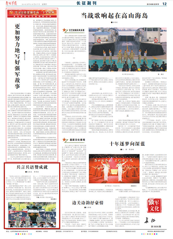 “创排节目的过程,也是重温报告、学深一层的过程。”装步六连指导员刘忠迪在表演结束后说。早在大会召开之前,表演小分队便多次在官兵中征集优秀创意和现实素材。大会召开期间,他们原原本本学习报告内容并认真研读相关文章。接下来,他们要创作更多宣传大会精神的作品。