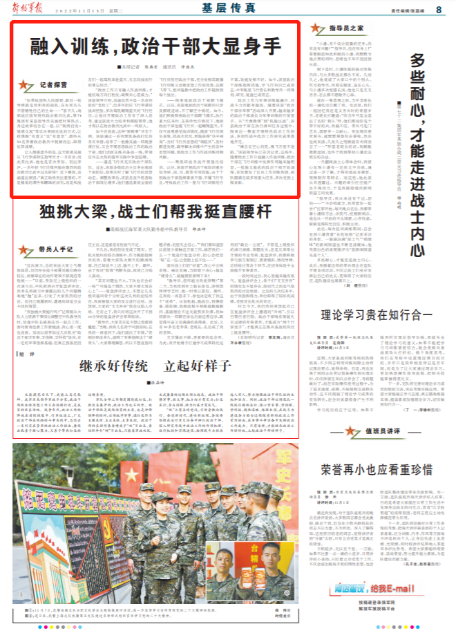 如今在该旅,这种“新鲜事”并非个例。该旅通过一系列聚焦备战打仗的务实举措,培养了一批像吴涵一样既善谋打仗、又会开展思想政治工作的政治干部,他们活跃在练兵备战一线,带领官兵在火热的强军实践中争创佳绩。