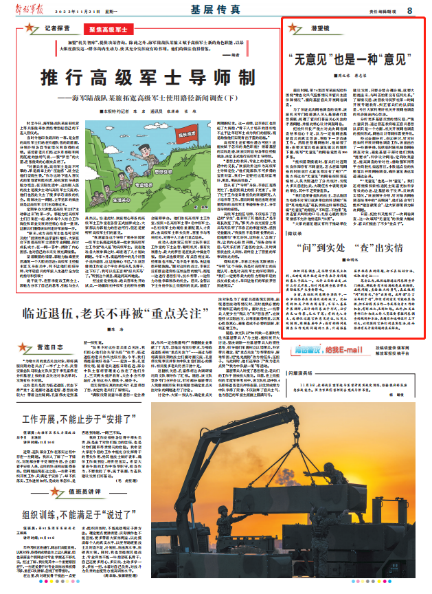 “‘无意见’也是一种‘意见’。我们还将继续探索畅通民主渠道更加科学有效的办法,让基层敢于发声,反映真实情况。”该旅领导介绍,针对每次问卷调查结果中的“高频词”,他们还会专门组织“建言献策会”,让大家群策群力解决问题。