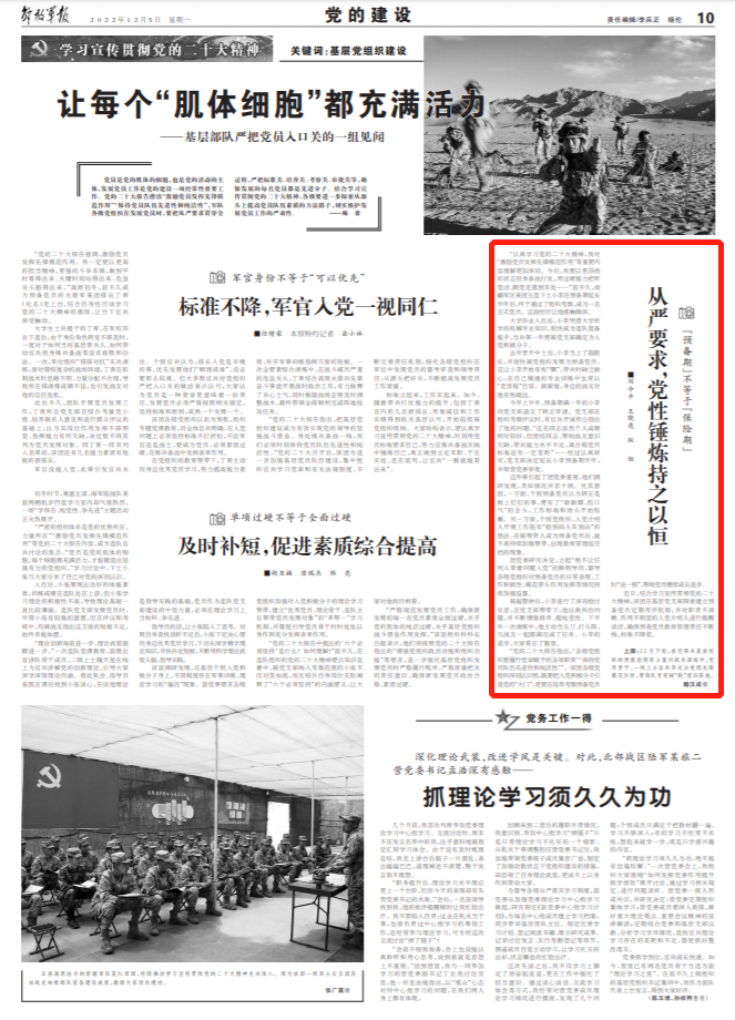 “认真学习党的二十大精神,我对‘激励党员发挥先锋模范作用’等重要内容理解更加深刻。今后,我要以更昂扬的状态投身备战打仗,用过硬能力把听党话、跟党走落到实处……”前不久,南疆军区某团五连下士小李在预备期延长半年后,终于通过了组织考察,成为一名正式党员。这段经历让他感触颇深。