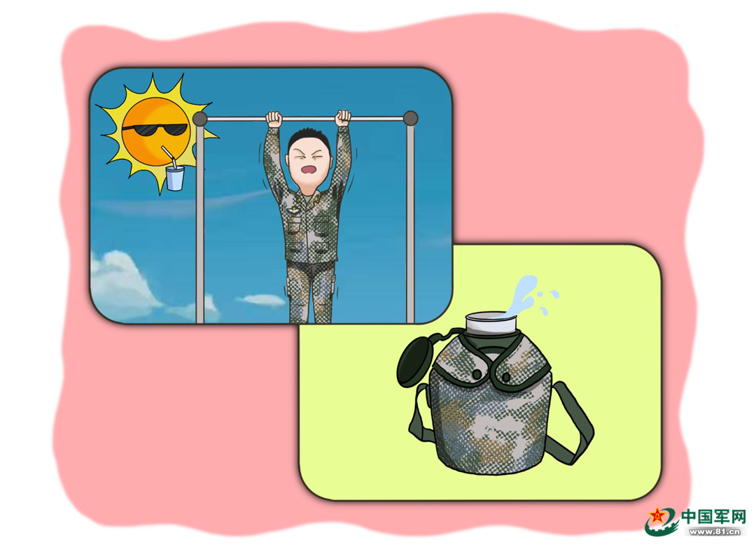 天气炎热、野外训练强度大,注意水壶装满水,避免长时间暴晒。