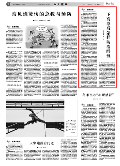 出现醉氧反应该怎么办?孙军医提醒大家,醉氧反应的严重程度和消失时间不仅受驻地海拔高度、高原活动时间、年龄、训练强度等因素的影响,还与心理状态和自我调节能力有关。面对醉氧反应能保持良好心态,并主动进行改善的战友,醉氧症状的持续时间往往较短;如果过度紧张、焦虑,可能会加长醉氧期,甚至加重醉氧症状。因此,战友们出现醉氧反应后不要过度担心,可积极采取措施进行调节。如果回到平原后出现疲倦、胸闷、头昏等症状,可先在家中休息几天。注意早睡早起、坚持午休,保证充足的睡眠时间。同时多参加户外活动,以增加通气,逐渐改善心肺功能,避免嗜睡及其他并发症发生。若一周左右症状未缓解,且出现腹泻、呕吐等情况,应及时前往医院就诊。若确诊为醉氧反应,且排除其他疾病,可在医生指导下进行高压氧治疗,以改善中枢神经供氧、促进脑功能恢复。一般经过1-2次治疗,醉氧症状就能得到有效缓解。返回平原后还要注意饮食,多吃一些抗氧化食物,如番茄、草莓、橘子、豆制品等;每日饮水2-3升,症状较重者可用红参、西洋参泡水喝,建议饮用1-2周,或在医生指导下口服维生素E。要注意的是,高血压患者不能用红参、西洋参泡水饮用。