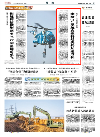 该旅二级军士长、特战骨干赵彦俊告诉笔者,以往新跳伞员只能依靠长期、艰苦的地面训练掌握伞降技能,人才成长周期长、见效慢。现在有了伞降VR系统,新跳伞员在室内就能完成离机、操纵、特情处置、着陆等动作训练,有助于他们短时间内掌握伞降动作要领,提高伞降技术水平和特情处置能力,锤炼离机不慌、遇险不乱的过硬心理素质。