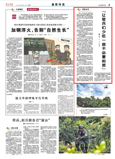 这几年,随着实战化训练不断深入,动辄几个月的野外驻训已成常态。李潮嵘意识到,面对官兵提出的类似合理需求,不能简单地用“驻训就应该多吃苦”来回应,该办的实事要办、该解的难题要解,否则势必影响大家的思想稳定和训练热情。