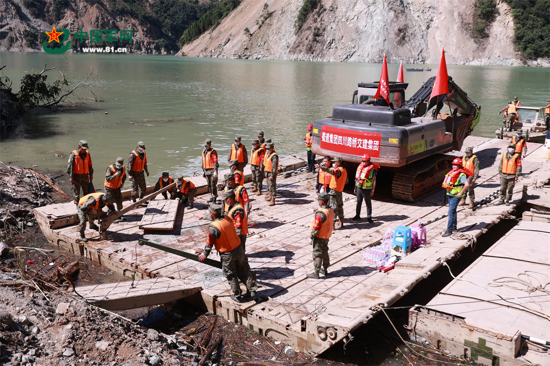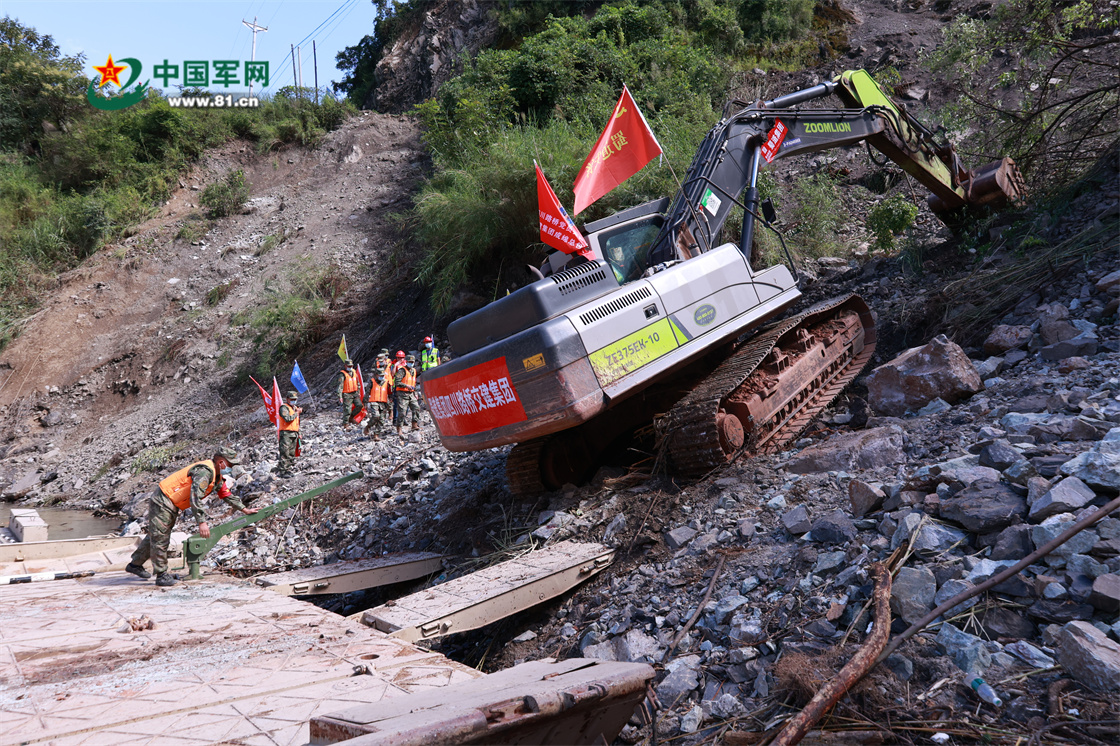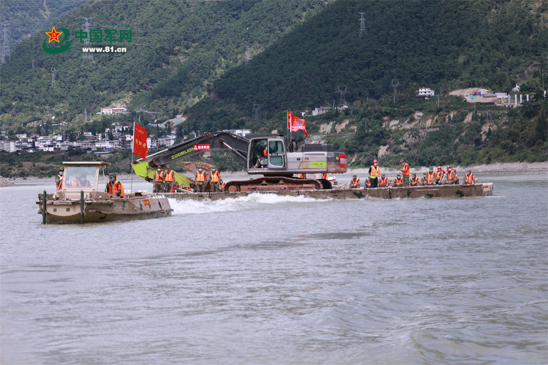 每台重型挖掘机都需要1个多小时的漕渡,1台、2台、3台……数小时后,多台重型挖掘机终于在大渡河对岸的芝麻沱、郑家坪等临时渡口抢滩登陆,左右开弓向两端施工作业。原本全线瘫痪的省道217泸定至安顺场之间路段,在舟桥官兵和地方施工人员的配合下,正加速抢通。