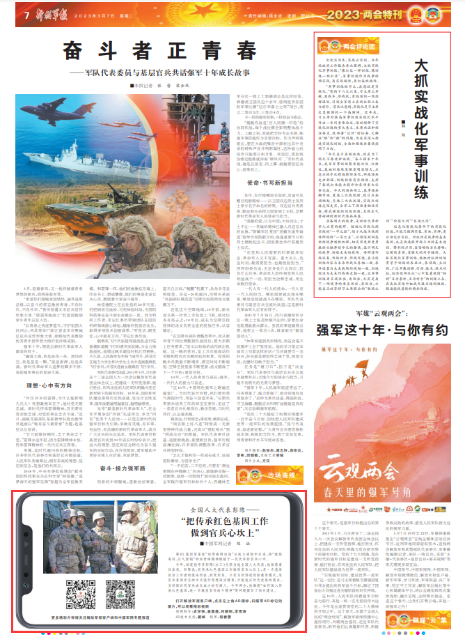 今年,该连指导员彭陈(左三)光荣当选全国人大代表,他深感重任在肩。彭陈说,把传承红色基因工作做到官兵心坎上,是一名基层政治工作者的使命所在、职责所系。只有与时俱进创新教育模式,用官兵喜闻乐见的方式进行思想政治教育,才能适应时代发展的需求,当好新时代官兵成长成才的引路人。今年两会,他围绕“如何深入传承红色基因,进一步激发官兵战斗精神”等问题撰写了相关建议。