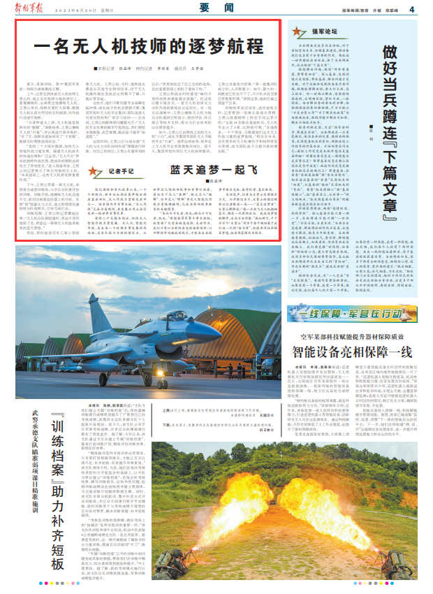 这些年,他们不断向着专业高峰发起冲锋,成长成才的机会源源不断:集团军组织无人机专业集训、部队选派人员前往院校和厂家学习培训……言谈间,王贵山的眼神里闪耀着光芒:“无人机专业发展的脚步行稳致远,我们要把本领练强、武艺练精,跑出奋斗强军‘加速度’。”