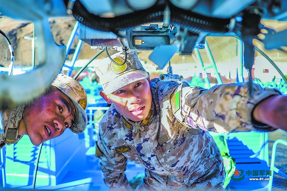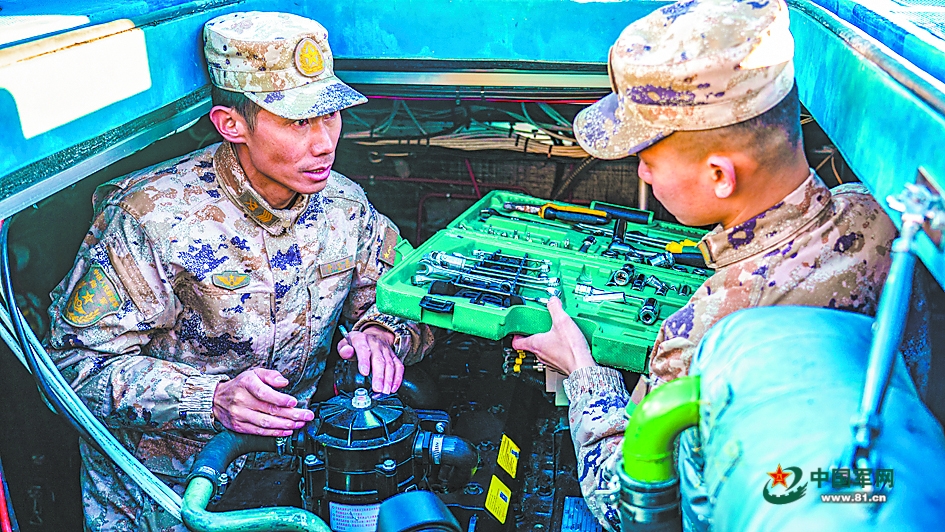 李小兵(左)指导战友排除巡逻艇机械故障。郭中正摄