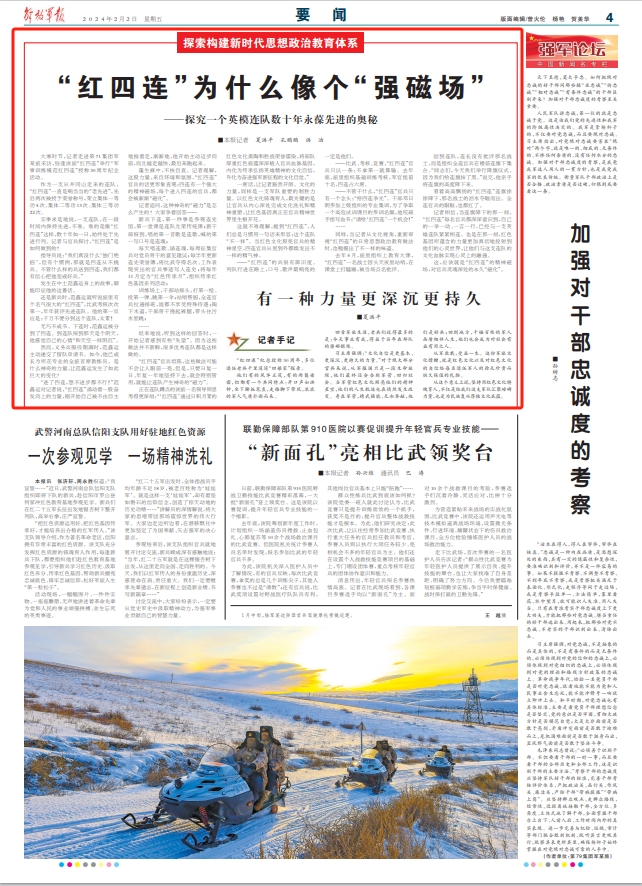 正在连队蹲点的该旅一名领导则思考得更深刻:“‘红四连’通过日积月累的红色文化熏陶和胜战荣誉濡染,将部队厚重红色底蕴深深植入官兵血脉基因,内化为传承弘扬英雄精神的文化自信,外化为奋进强军新征程的文化自觉。”
