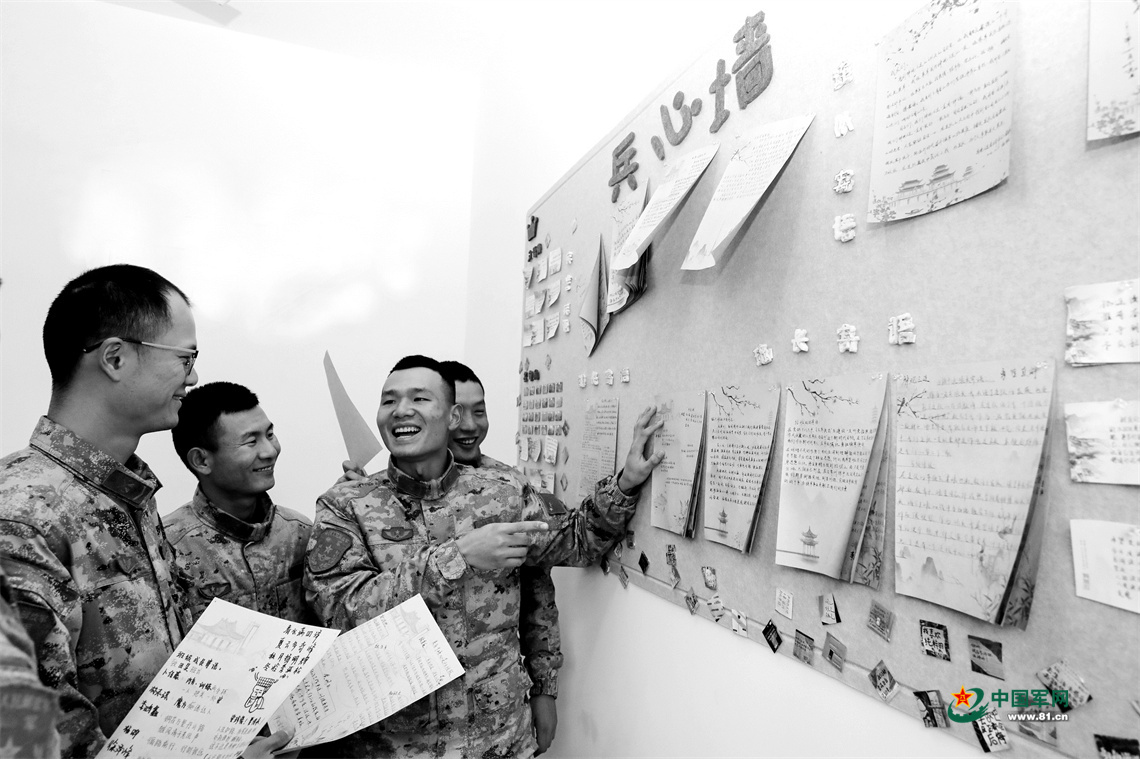 官兵驻足“兵心墙”前交流讨论。唐 田摄