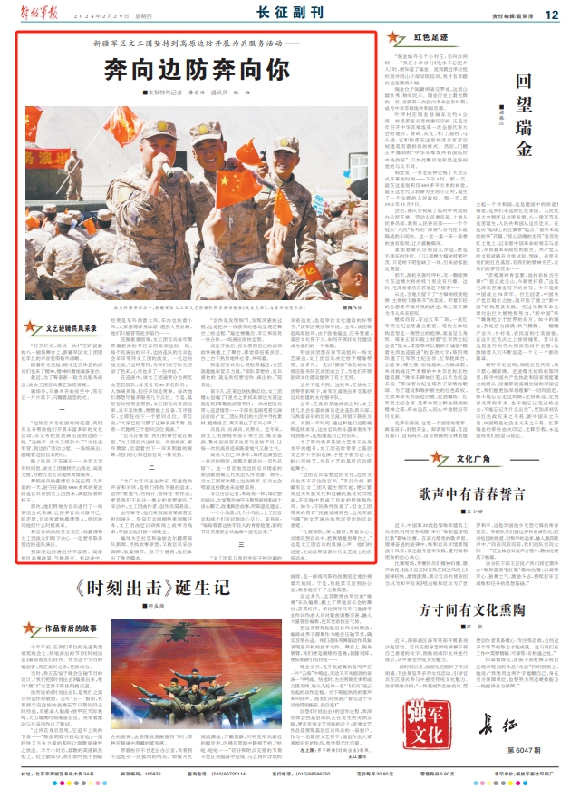 前不久,在某边防执勤点位,文工团精心创编了《星光之梦》《高原边关》《这就是我》等歌曲演唱节目,一次次把官兵带入巡逻情景……干部史基刚观看完演出后说:“文工团从我们的生活中寻找素材、提炼语言,真实表达了官兵心声。”