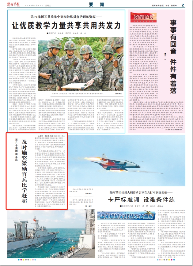 日常训练中,他们引入评比竞赛机制,分阶段、分层次、分专业岗位开展小评比、小竞赛活动,并利用训练讲评、晚点名等时机,让成绩突出的同志分享经验、交流体会;在训练场显要位置设置“龙虎榜”,张贴训练尖子个人照片,宣传推介其先进事迹;组织“连史留名”“成长微故事”等活动,大力营造“训练尖子出彩、精武标兵荣耀”浓厚氛围,引导官兵对标榜样创先争优。