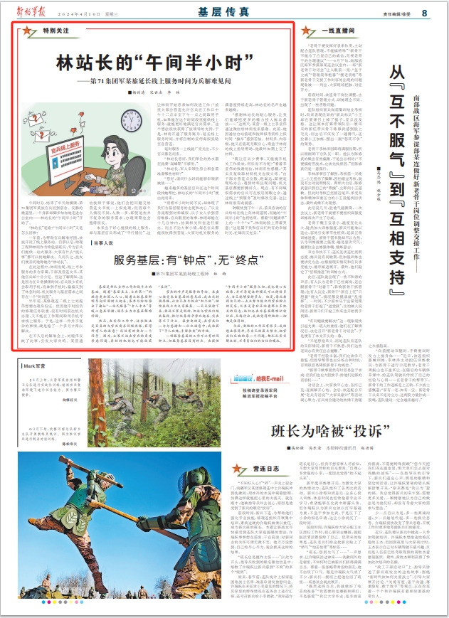 越来越多的基层官兵在这个时间段找她帮忙,林站长的“午间半小时”便由此而来。