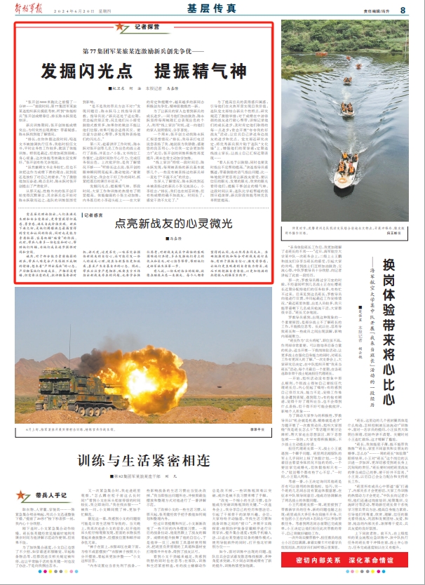 发掘闪光点,提振精气神。那段时间,大家工作和训练的热情有了明显提高。体能偏弱的小张主动加练,内务落后的小李迎头赶上……在大家的肯定和提醒中,越来越多的新同志积极创先争优,精神面貌焕然一新。