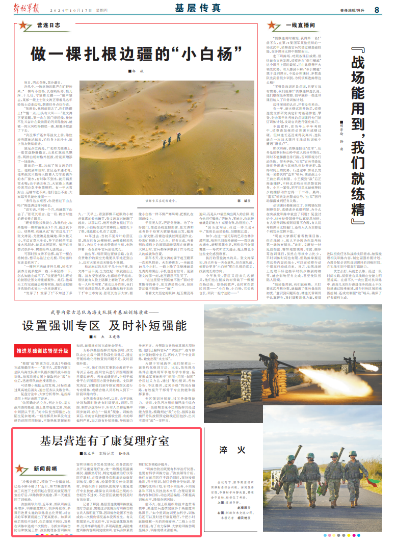 该旅领导介绍,近年来,部队训练任务增多、训练强度加大,很多跨昼夜、多课目连贯实施的训练常态化开展,对官兵的军事素质提出了更高要求。如果训练后放松不及时、伤后康复不到位,容易在训练中造成二次损伤。为抓实训练伤防治和恢复工作,该旅梳理各营训练内容和训练伤多发易发情况,在各营医疗点开设康复理疗室,统一购置超低温镇痛仪、磁振热疗仪、特定电磁波治疗仪等医疗器材,在营连健身房配备运动康复训练仪、牵引床、松紧带等拉伸恢复器材,并组织骨干到部队医院学习康复理疗专业技能,确保官兵训练后出现的小伤轻伤不过夜、不出营区就能得到及时有效处置。