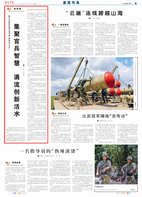 “官兵们的智慧成果,给连队战斗力建设不断注入创新活水。”该连主官说,“成果分享会”不仅解决了具体问题,还塑造着连队文化。官兵们依靠创新革新攻坚克难的意识和能力日渐增强。
