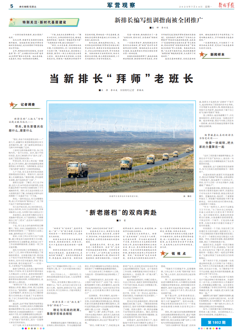 “带兵,首先要真正懂兵在想什么、需要什么。”如今,这句话已成为母玉龙的口头禅。他深知,新排长有不足、老班长有优势,双方互相补台,才能实现真正的好戏连台。