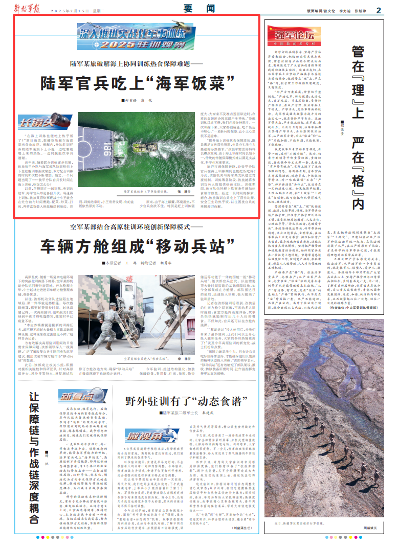 “在海上训练也能吃上热乎饭了!”夏日海滨,数艘登陆舰在海面犁出朵朵浪花。舰艇内,参加驻训任务的陆军某旅下士小赵一边吃着刚端上来的热饭,一边向舰艇炊事员道谢。