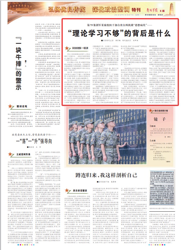 短短一周内,全旅干部自查自纠不再“躲躲闪闪”,而是直指群众观念出现偏差、政绩观出现偏差、担当意识出现偏差等3类“思想病灶”——