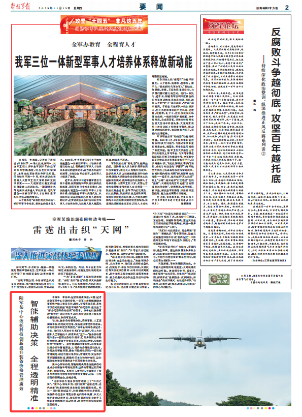 “以往,装备价格管理分散、资源零散,人工查询效率低,价格比对困难,装备建设常受价格虚高、市场核价保鲜度差等困扰。”该中心领导告诉记者,为此,他们深入军地有关部门广泛调研,引入大数据和人工智能技术,探索形成“三个一”装备价格管理体系:一套历史价格数据库,汇集多源历史采购价格信息,覆盖主要装备品类,构建起完整、权威的价格“档案馆”;一套智能辅助决策系统,深度集成数据分析和智能算法,实现价格合理性自动比对、异常波动智能预警、潜在风险精准识别;一套数据管理规范,制订数据采集存储、管理使用、安全维护等多项管理制度,明确责任主体和维护流程,让数据价值在装备管理的各个环节得到充分体现。