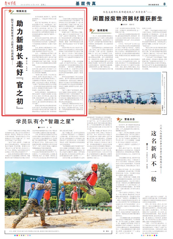 “推行‘点餐式’培训机制后,新排长见习锻炼不再是以前那种‘大呼隆’,变得更有针对性了,质效显著提升。”该旅“管理教育模范连”蔡指导员介绍,他们为所有见习锻炼的新排长细化了“成长清单”,帮助他们结合岗位实际、个人特长和志向快速成长。
