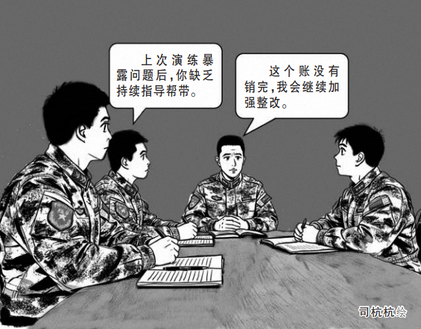 对副书记整改情况“对账”时,大家的发言令他额头冒汗:“上次连队组织夜间应急分队演练暴露出不少问题,你仅要求骨干牵头整改,缺乏持续指导帮带,导致近期演练同类问题再次出现。”听完,副书记主动表示这个账没销完:“当时想着交给骨干就行,这说明我责任心不强,我会继续整改!”