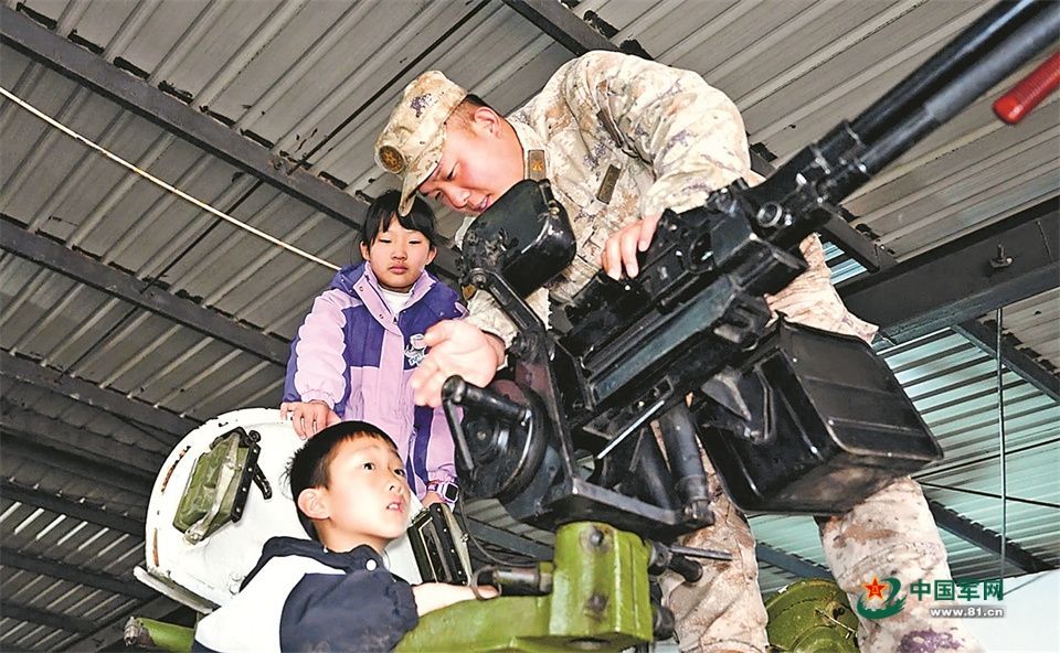 在装备展示区,坦克、步兵战车一字排开,王梦翔踮起脚尖、仰着脑袋,努力凑近装备仔细打量,时不时好奇地提问:“这个炮能打多远”“坦克里面热不热”……成广通耐心细致地一一作答,还手把手教他认识枪械构造。