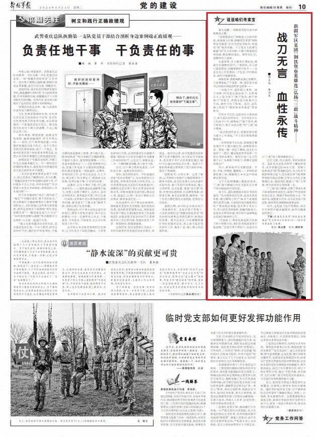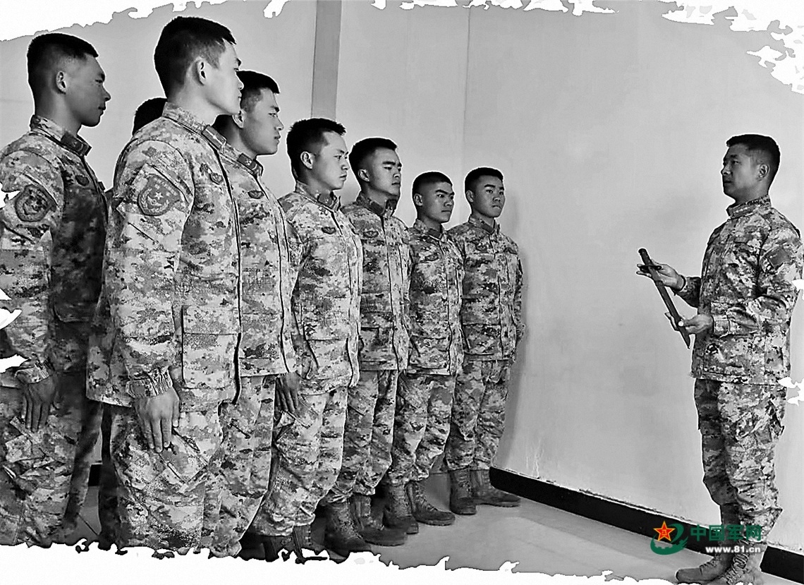 新疆军区某团“钢铁堡垒英雄连”党支部书记毕海洋(右一)组织官兵重温战刀故事。摄影:商占营 制图:周怀军