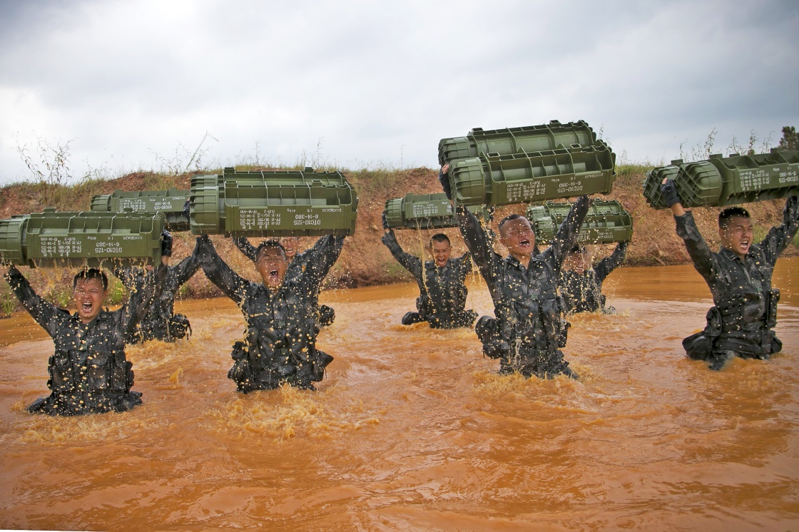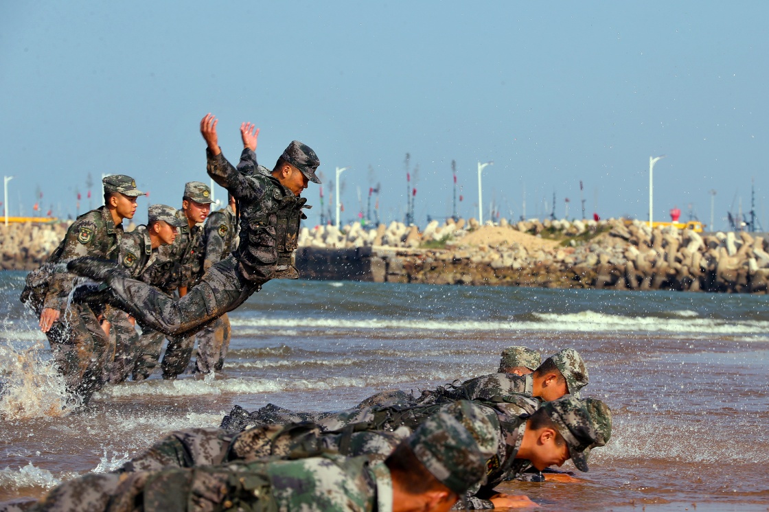 陆军第71集团军某旅“王杰班”在某海训场进行战术训练(2018年7月21日摄)。新华社发(李志浩 摄)