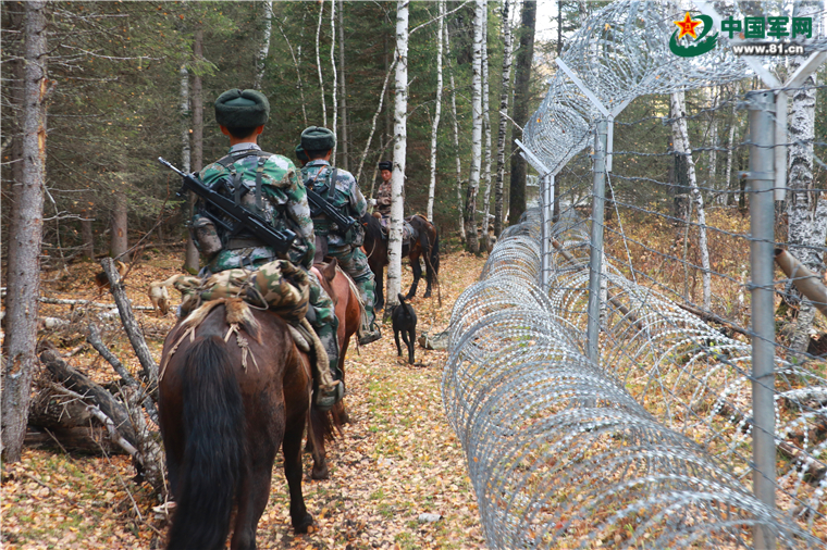 官兵骑马沿着边境铁丝网巡逻。徐明远摄