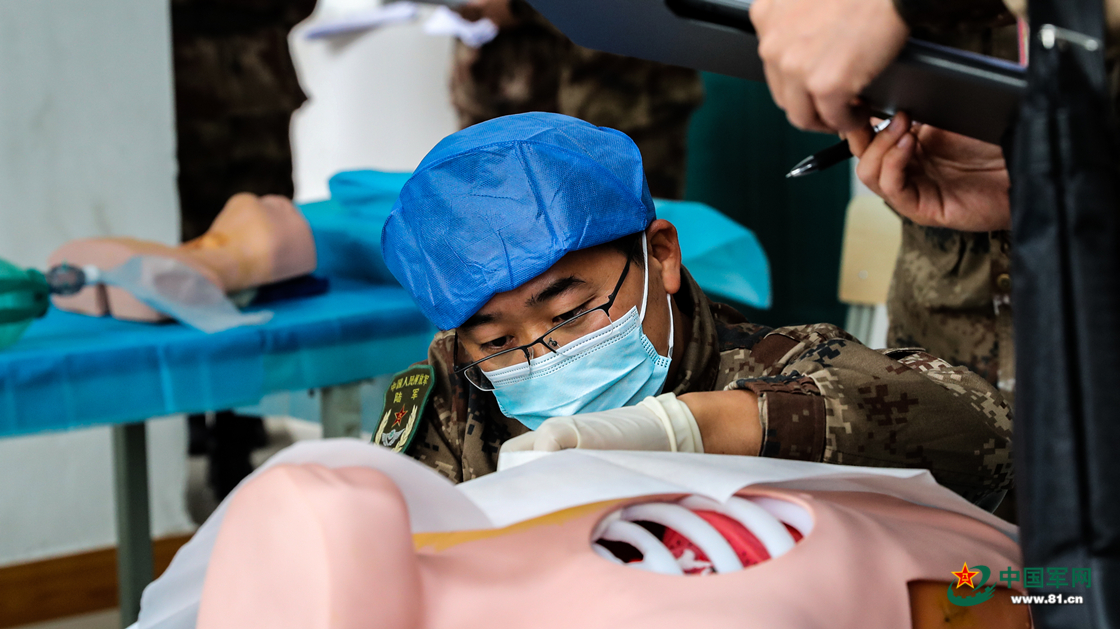 该旅军医进行胸腔闭式引流术考核。
