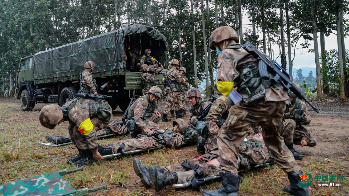 卫勤官兵对伤员进行搬运。