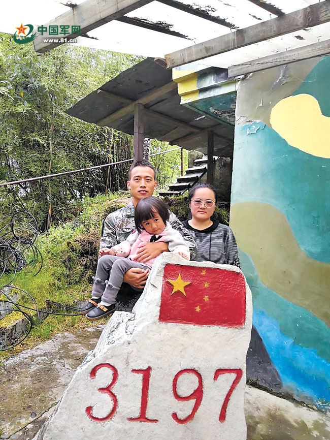 2019年8月,西藏山南军分区某边防团四级军士长黄世荣的妻子林建琼,带着女儿到军营探亲,一家人登上3197哨所,在戍边石前合影留念。骆准世摄