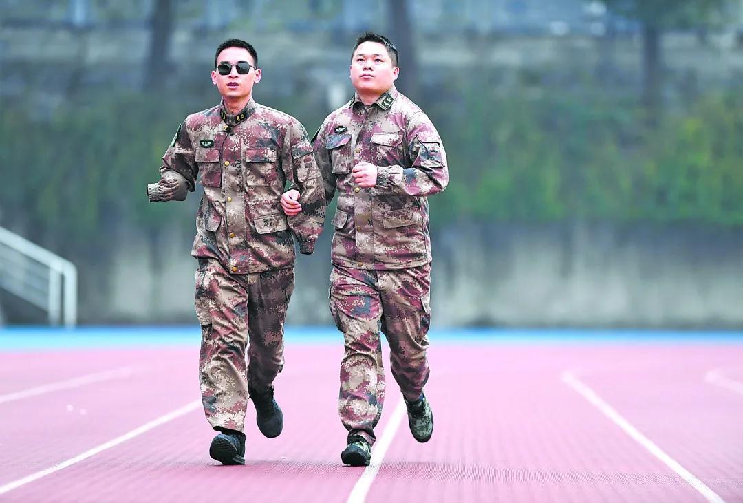 杜富国(左)和战友在跑步。新华社发
