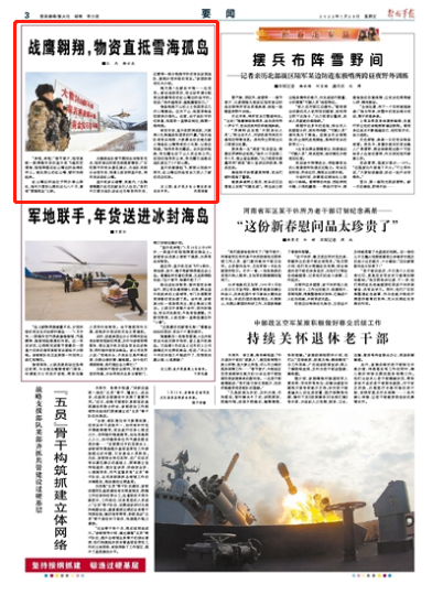 为确保连队春节期间生活物资充足,陆军某边防团党委提前筹划,广泛收集守防官兵意见建议,为连队采购20余类年货,报请上级安排直升机,将年货送进红山嘴。