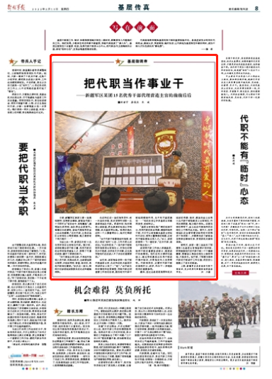 该团将代职工作纳入抓建基层、培养干部的重要组成部分,提前进行系统筹划。他们在充分调研的基础上,通过考核遴选出优秀干部进行集中培训,并常指定专人负责帮带。代职结束后,还要对代职干部的表现打分、讲评,作为下一步提拔使用的重要参考。