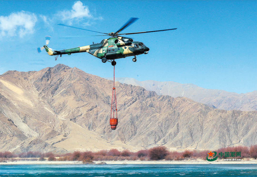 3月23日,西藏军区某旅开展吊桶灭火课目演练,锤炼部队应急救援能力。白 齐摄