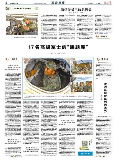 “让每名高级军士找出一个基层热点矛盾问题,形成一份可以供机关和基层借鉴参考的调研报告,并由他亲自审稿。此外,各科室要把基层重难点问题拉单列表,供高级军士寻找新问题……”