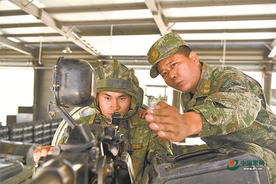 三级军士长毛彦阁(右)为战士讲解装备使用方法。