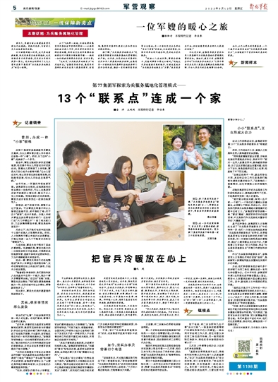 不仅是刘丽,该集团军很多官兵和军人家属都对为兵服务属地化管理模式赞誉有加。据统计,截至目前,该集团军各单位“为兵服务异地联系点”已累计帮助官兵及军人家属妥善解决包括医疗保障、子女入学在内的各类难事500余件。