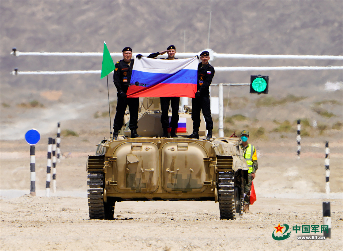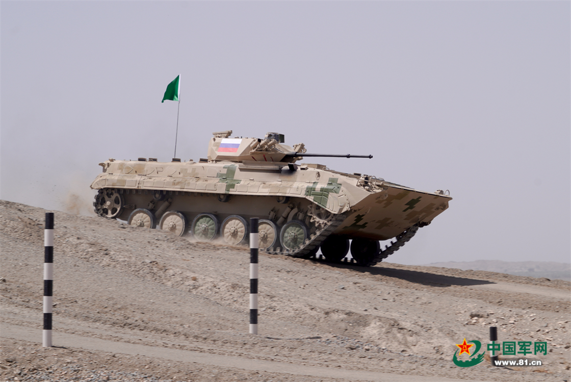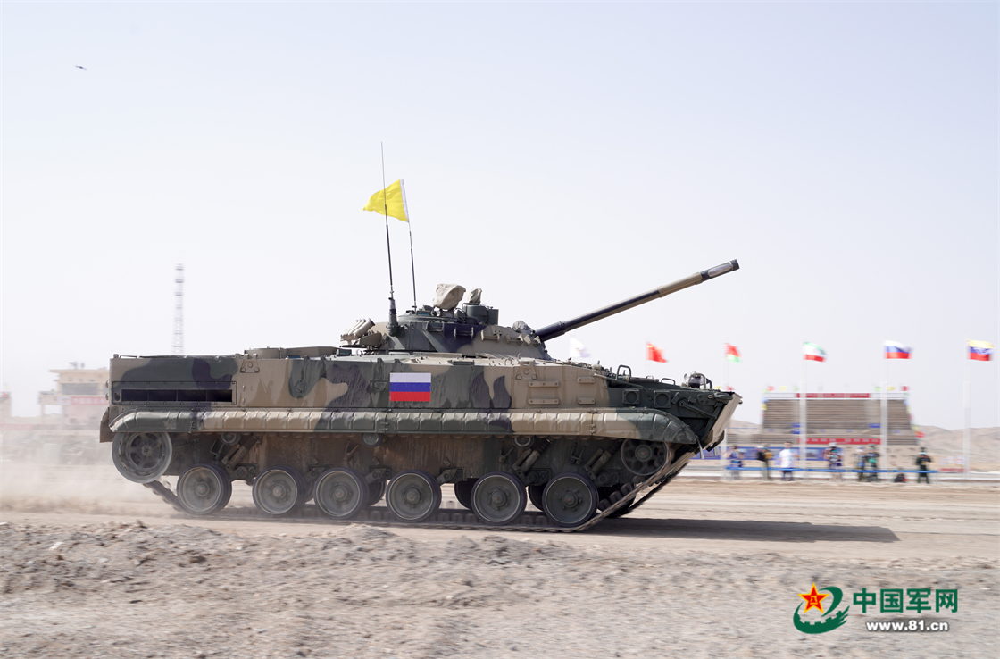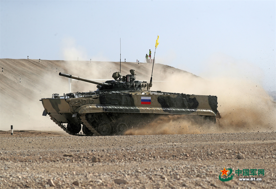 俄罗斯参赛队驾驶步战车疾驰在赛道上。罗兴仓 摄