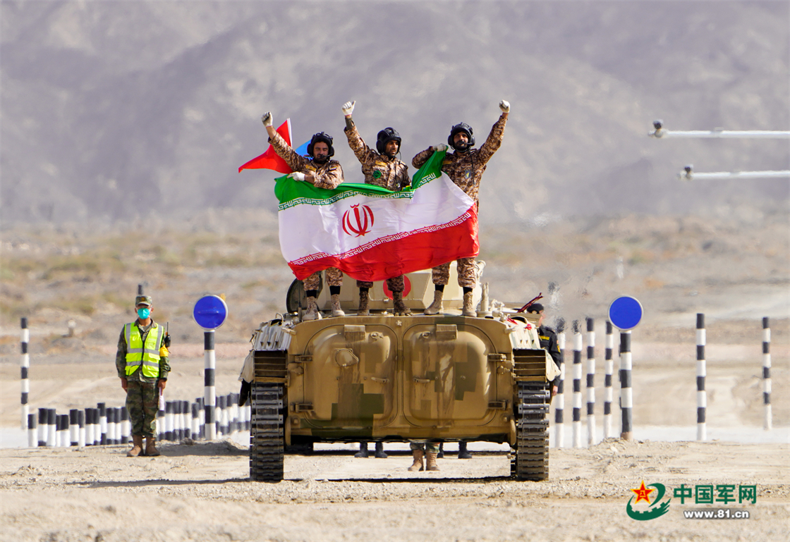伊朗参赛队员驾驶步战车飞跃车辙桥。栾铖 摄