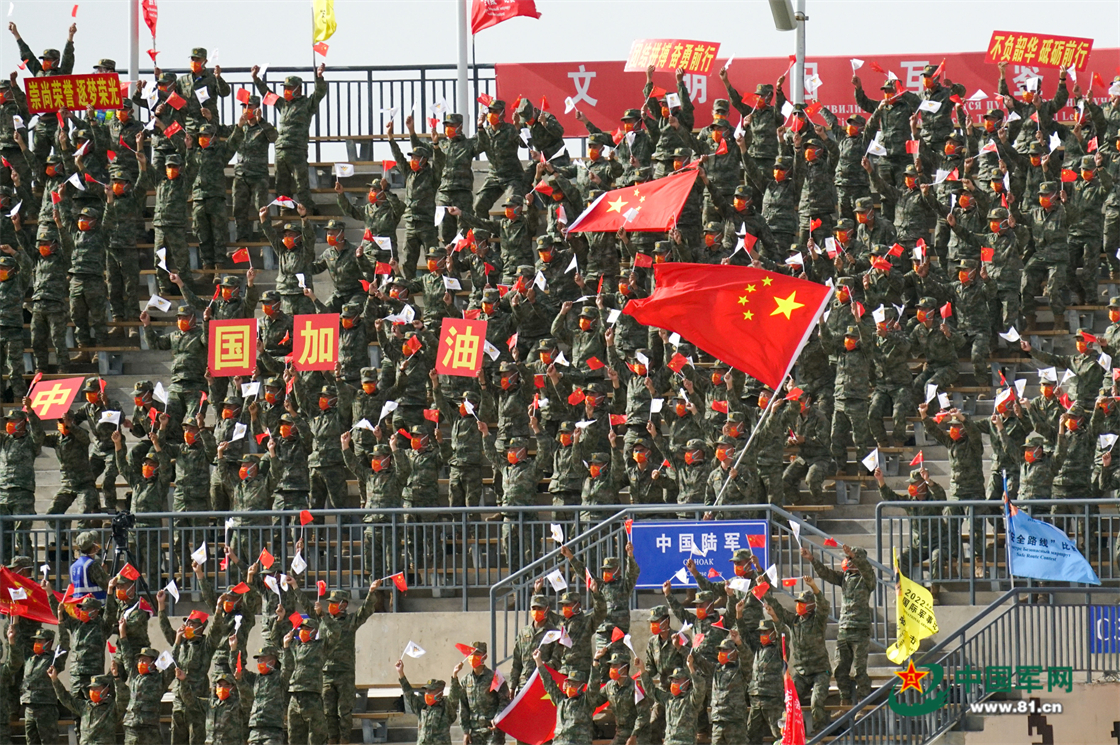 新疆库尔勒赛区观礼台观众为队员加油鼓劲。栾铖 摄